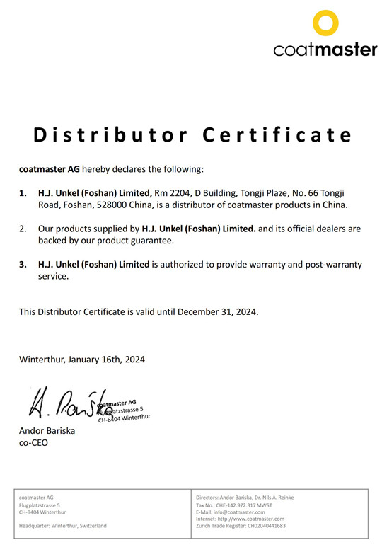 翁開爾公司與瑞士涂魔師Coatmaster公司達(dá)成合作協(xié)議,佛山翁開爾是瑞士涂魔師Coatmaster的中國區(qū)代理。