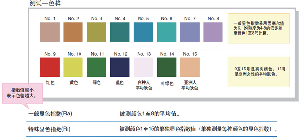 顯色指數(shù)包括一般顯色指數(shù)(Ra)和特殊顯色指數(shù)(R1至R15)