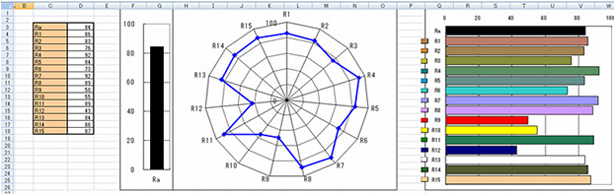 顯色指數(shù)采用直觀顯示,便于理解。被測光源和標(biāo)準(zhǔn)光源的色差一目了然,條形圖顯示一般顯色指數(shù)Ra(特殊顯色指數(shù)R1至R8的平均值)和15種特殊顯色指數(shù)(R1至R15)。