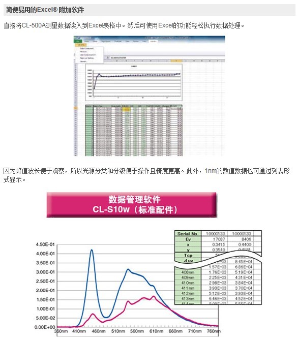 | 類型 | Excel®附加軟件提供更好的可操作性和數(shù)據(jù)管理功能。直接將測量數(shù)據(jù)讀入到Excel®,兼容CL-200A/CL-200、CL-500A。 儀器連接電腦軟件提供LED分級功能及自動校準(zhǔn)功能。 |