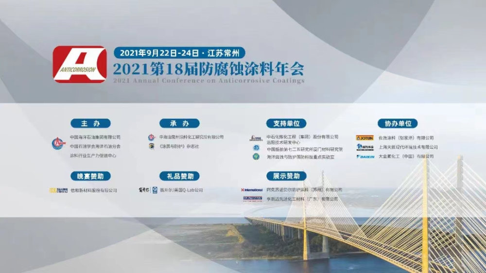 本次會議由中國海洋石油集團有限公司、中國石油學(xué)會海洋石油分會、涂料行業(yè)生產(chǎn)力促進中心主辦,中海油常州涂料化工研究院有限公司、《涂層與防護》雜志社承辦,中石化煉化工程(集團)股份有限公司洛陽技術(shù)研發(fā)中心、中國船舶第七二五研究所廈門材料研究院、海洋腐蝕與防護國防科技重點實驗室支持。