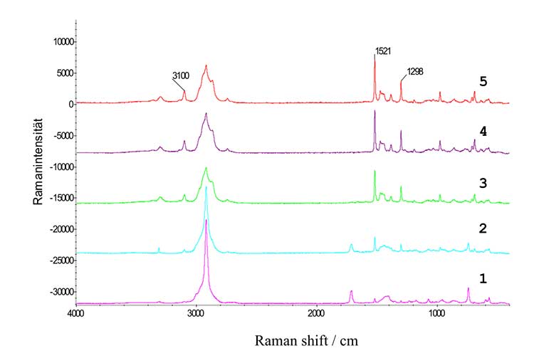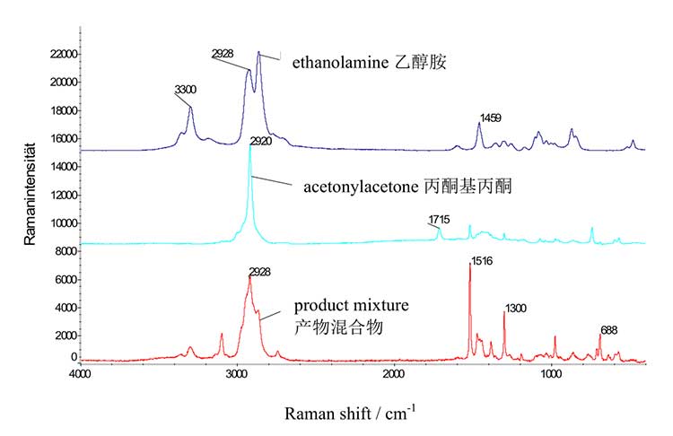 目前理想的光譜分析方法是拉曼光譜,因?yàn)槔盘?hào)不會(huì)被吸收或受到玻璃蓋影響。選擇Paal-Knorr-合成作為測(cè)試化學(xué)反應(yīng),使用丙酮基丙酮和乙醇胺離析物,它們的產(chǎn)物是取代吡咯。離析物和產(chǎn)物的混合物的拉曼光譜如圖3所示。