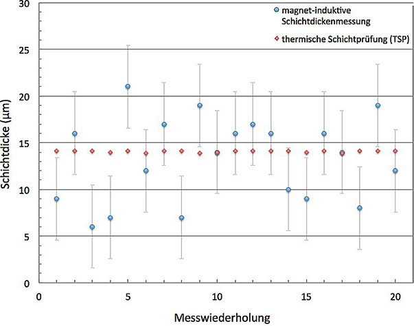 傳統(tǒng)磁感應方法與Coatmaster熱層法的涂層厚度對比,測試在測量中的振動阻尼環(huán)上進行確定