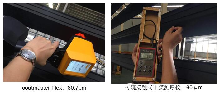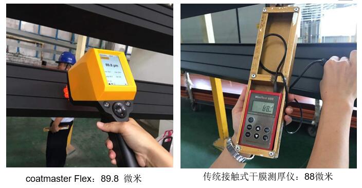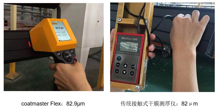 用戶得知手持非接觸膜厚分析儀coatmaster flex可以檢測固化前濕膜厚度后,使用該膜厚分析儀與干膜測厚儀進行對比測試,發(fā)現(xiàn)對鋁型材上相同位置測試數(shù)據(jù)接近,且coatmaster Flex重復(fù)性和精度更好;