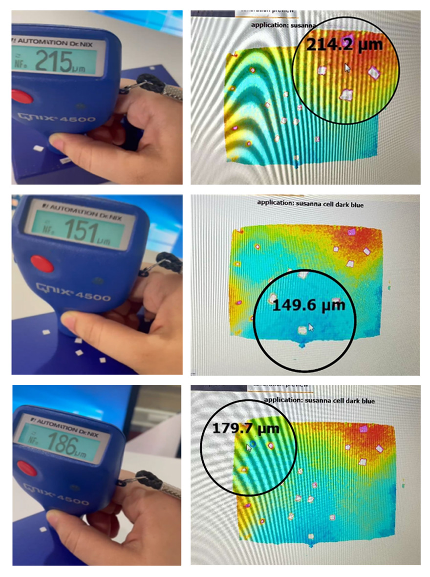 針對(duì)上述問題,涂魔師?3D非接觸整體膜厚成像系統(tǒng)是棱邊或R角絕緣涂層優(yōu)選測厚方案,涂魔師采用ATO技術(shù)五秒快速檢測電芯或外殼整體絕緣涂層(粉末涂料或UV涂料)厚度分布情況,實(shí)現(xiàn)高精度、非接觸測厚。甚至在粉末涂料未固化狀態(tài)下即可測出固化后干膜厚度,協(xié)助涂裝廠家調(diào)整噴涂參數(shù),使絕緣粉末達(dá)到更窄的合格膜厚范圍,提高電芯良品率,降低生產(chǎn)成本。既能滿足汽車主機(jī)廠和電池廠的要求,也能提高自身的盈利能力。