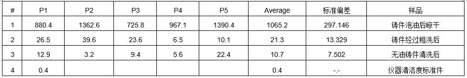 1 | 在會議室的零件測試 | 3件樣品: 鑄件泡油后晾干、鑄件經(jīng)過粗洗后、無油鑄件清洗后 |