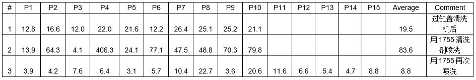 1、 用1755第一次噴洗,有一測量點的清潔度為RFU460,導(dǎo)致整個工件的清潔度平均值大幅升高。 此測量點的污染情況估計是由于1755噴洗時引起孔洞里的油污流出再次污染表面而造成。