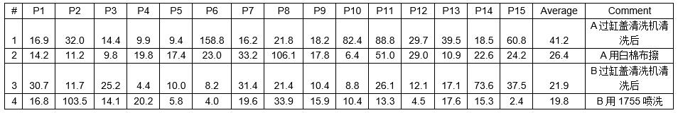 B樣品為右邊的缸蓋。測試目的:1755清洗劑的有效性以及不同噴洗過程的清潔度差異。